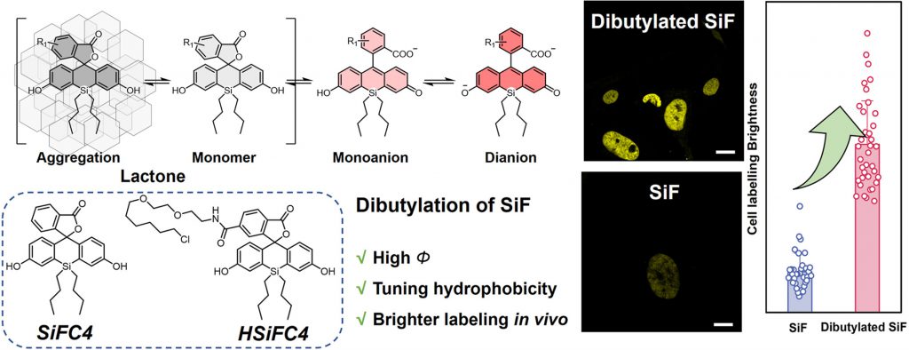 Fluorescein derivatives, characterized by a xanthene backbone, represent a prominent class of organic molecular dyes. Through silicon atom substitution, silicon-substituted fluoresceins (SiFs) exhibit bathochromic emission spectra with high quantum yields. However, the anionic configuration significantly restricts their application in vivo. Herein, we reported dibutylated silicon fluorescein, SiFC4 and HSiFC4. With increased hydrophobicity by dibutylation, SiFC4 tends to convert into the neutral lactone form and enables its aggregation (150 nm in diameter) with substantially reduced background fluorescence at physiological pH. Notably, HSiFC4 demonstrates 4.3-fold enhanced fluorogenicity in HaloTag labeling systems and robust fluorescence response (4.1-fold) in living cell imaging compared to its dimethyl derivative, HSiFC1. This approach underscores the potential of alkylation in modulating the properties of fluorophores, offering a promising strategy for advanced applications in the future.